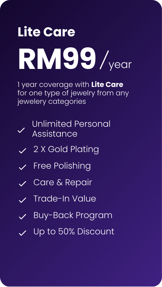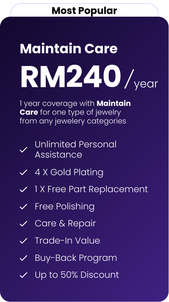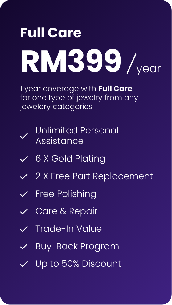 A comprehensive jewelry care solution offering a combination of jewelry services and repair coverage for your care jewelry, jewelry and wearables plus all your jewelry material types for up to 1 year at savings price.